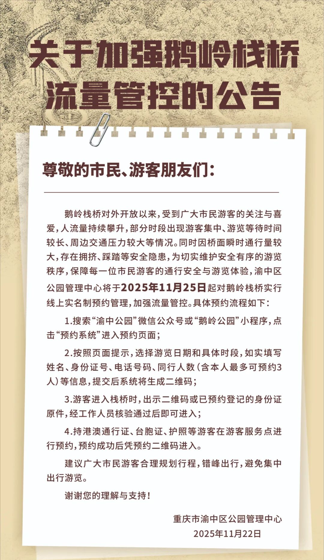 鹅岭栈桥对外开放以来,受到广大市民游客的关注与喜爱,人流量持续攀升,部分时段出现游客集中、游览等待时间较长、周边交通压力较大等情况。同时因桥面瞬时通行量较大,存在拥挤、踩踏等安全隐患,为切实维护安全有序的游览秩序,保障每一位市民游客的通行安全与游览体验,渝中区公园管理中心将于2025年11月25日起对鹅岭栈桥实行线上实名制预约管理,加强流量管控。具体预约流程如下: