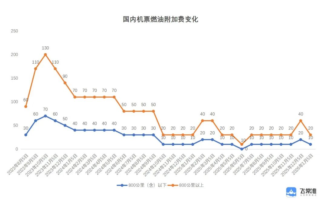 据了解,此次调整后,国内航线里程800公里及以下航段,每名旅客每个航段收取燃油附加费10元,800公里以上航段,每名旅客每个航段收取燃油附加费20元。与调整之前相比,征收标准分别下降了10元、20元。