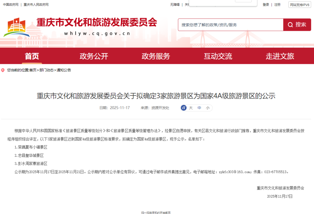 公示称,根据中华人民共和国国家标准《旅游景区质量等级划分》和《旅游景区质量等级管理办法》,经景区自愿申报,有关区县文化和旅游行政部门推荐,市文旅委按程序组织综合评定,荣昌夏布小镇景区、忠县皇华城景区、彭水周家寨旅游区3家旅游景区达到国家4A级旅游景区标准要求,拟确定为国家4A级旅游景区,现予公示。