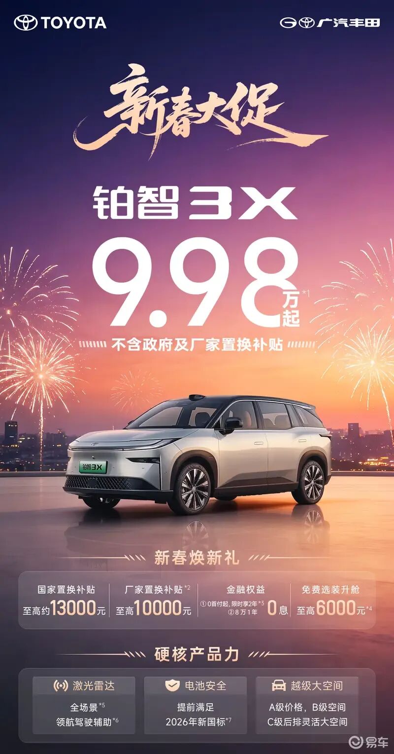 1月5日,广汽丰田宣布旗下铂智3X新春限时大促,厂家直补1万元,补贴后售价区间为9.98-14.98万元。