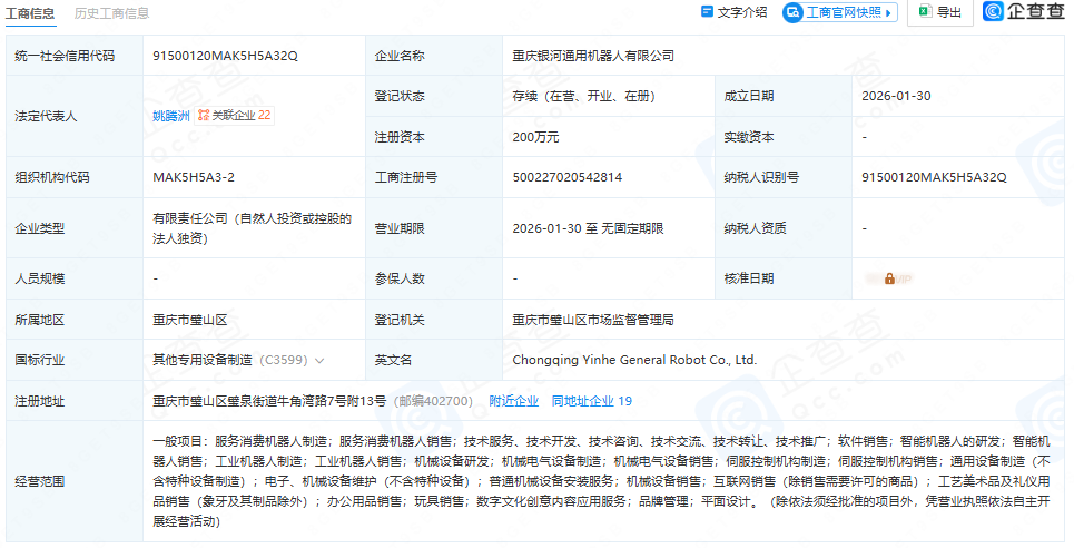 企查查APP显示,近日,重庆银河通用机器人有限公司成立,经营范围包含智能机器人的研发、智能机器人销售、工业机器人制造、工业机器人销售、机械设备研发等。企查查股权穿透显示,该公司由北京银河通用机器人股份有限公司(简称:银河通用)全资持股。